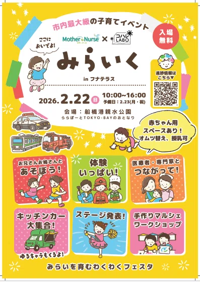 2月22日(日)は船橋港親水公園で市内最大級の子育てイベント「みらいくinフナテラス」が開催されます。